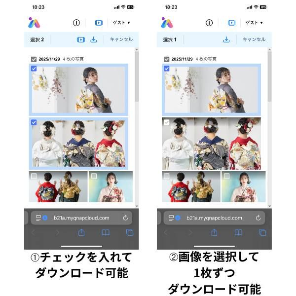 画像にチェックを入れてダウンロードボタンが表示されたらタップします。すべてにチェックを入れることも可能です